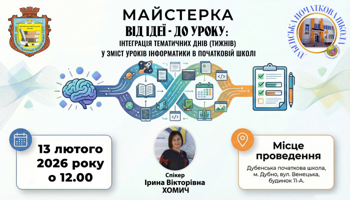 У сучасній українській школі відбувається трансформація підходів: від суворого поділу на предмети освіта рухається до цілісного сприйняття світу дитиною. Саме цю актуальну проблему було розглянуто 13 лютого 2026 року під час майстерки «Від ідеї - до уроку: інтеграція тематичних днів/тижнів у зміст уроків інформатики в початковій школі», проведеної для студентів ІІІ курсу ВСП «Дубенський педагогічний фаховий коледж РДГУ» на базі Дубенської початкової школи. Спікерка заходу, заступниця директора з навчально-виховної роботи та вчителька інформатики початкових класів Ірина Вікторівна Хомич запропонувала майбутнім педагогам поглянути на інформатику не як на ізольований технічний предмет, а як на інструмент дослідження та творчості.